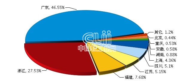 从地区出口情况看,比重主要集中在广东、浙江、福建、江苏、四川等地区。其中:广东完成累计出口额1.54亿美元(占46.55%),同比增长5.58%。