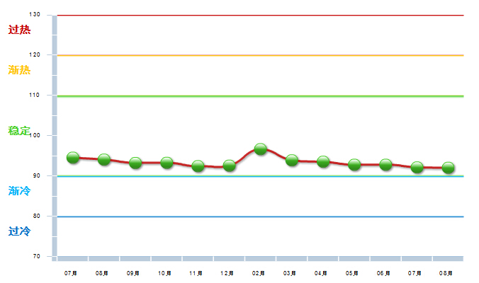 从分地区五金行业景气指数看,全国大部分地区以标志着“渐冷”和“过冷”的蓝色为主基调,与上月基本相同,整体偏冷。贵州和天津两个地区继续处于“过热”区域,依旧没有“渐热”区域,与7月相比没有变化。