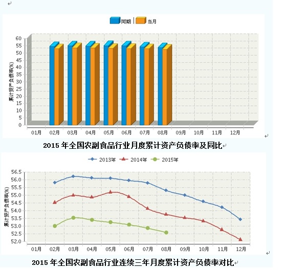 2015年1~8月,全国农副食品行业累计资产负债率为52.58%,同比增长-1.17%。其中:1月~2月份累计资产负债率为53.01%,同比增长-1.41%;1月~3月份累计资产负债率为53.54%,同比增长-1.4%;1月~4月份累计资产负债率为53.4%,同比增长-1.41%;1月~5月份累计资产负债率为53.25%,同比增长-1.85%;1月~6月份累计资产负债率为53.1%,同比增长-1.8%;1月~7月份累计资产负债率为52.87%,同比增长-1.29%;1月~8月份累计资产负债率为52.58%,同比增长-1.17%。