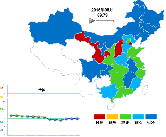 2014年7月至2015年2月,中轻皮革景气指数基本稳定,在90~100间小幅波动,处于稳定提示区的下半区。3月中轻皮革景气指数89首次跌入渐冷提示区, 6、7、8月虽然运行在渐冷提示区,但已逐步呈现企稳回升态势(参见图3)。