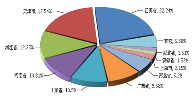 图1 2014.6—2015.7自行车行业主营业务收入景气指数变化态势 二、主营业务收入完成情况 2015年1月~7月,全国自行车制造行业累计完成主营业务收入793.86亿元,同比增长4.7%。今年以来,行业主营业务收入增速明显低于去年同期水平。(参见图2) 图2 2015年全国自行车行业累计主营业务收入及同比 2015年1-7月份全国自行车行业下辖的两个子行业完成主营业务收入的状况是:脚踏自行车及残疾人座车制造行业累计完成主营业务收入357.1亿元,同比增长5.56%;助动自行车制造行业累计完成主营业务收入436.76亿元,同比增长4.01%。 二、主营业务收入分地区完成情况 2015年1月~7月,全国自行车制造行业完成累计主营业务收入793.86亿元,同比增长4.70%。主要集中在江苏省、天津市、浙江省、河南省、山东省等地区,这5省市的比重占全国的73.34%(参见图3)。从增长情况来看,河南省增速最高,达到31.45%。 图3 2015年1~7月全国自行车行业累计主营业务收入地区占比情况