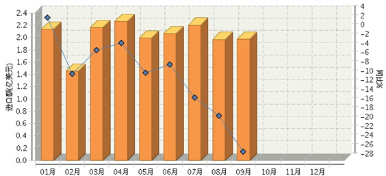 2015年1月~9月,全国五金行业完成累计进口额同比增长-10.39%,增速较去年同期下降了24.4个百分点。9月份完成进口额1.98亿美元,同比增长-26.1%,增速为2015年以来的最低值。