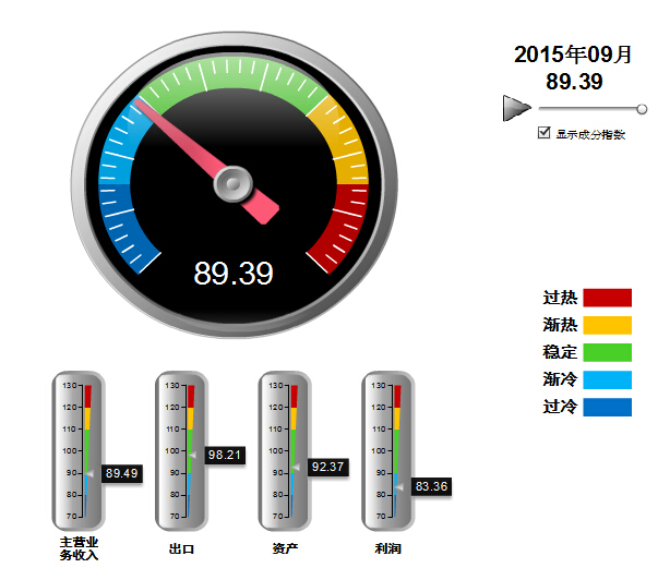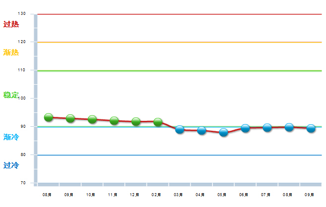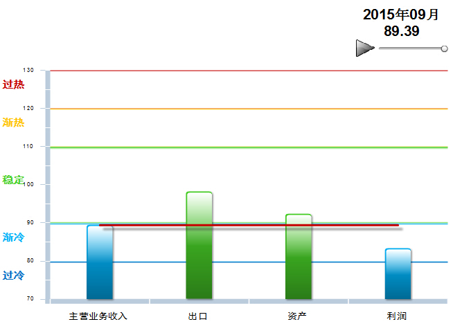 2014年8月至2015年2月,中轻皮革景气指数基本稳定,在90~100间小幅波动,处于稳定提示区的下半区。3月中轻皮革景气指数89首次跌入渐冷提示区, 9月仍然在渐冷提示区运行(参见图3)。