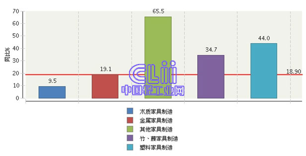 同期,其他家具制造业的累计利润总额增速(下称“累计增速”)最快,高达65.52%;塑料家具制造业的累计增速次之,达到44.02%;竹、藤家具制造业的累计增速第三,为34.66%;金属家具制造业的累计增速为19.11%,略高于家具行业平均水平;只有木质家具制造业的累计增速呈个位数增长(图5)。