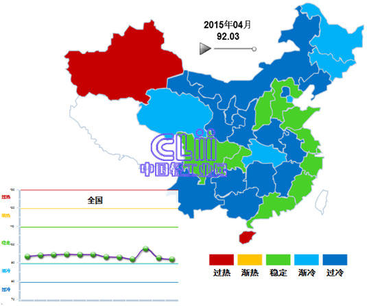 4月,只有新疆和海南2个地区仍处于“过热”区间,占全国地区总数(下同)的6.45%;“稳定”区间的地区数增至10个,占全国的32.26%,除江苏、上海、浙江、福建、广东及重庆6个地区与3月相同外,新增了山西、河北与山东3个地区;属于“渐冷”区间的地区依旧是5个,分别是黑龙江、吉林、天津、湖北及青海,占全国的16.13%;由于天津、四川分别变为“渐冷”和“稳定”,使得处于“过冷”区间的地区数降至13个,占全国的41.94%(图3)。