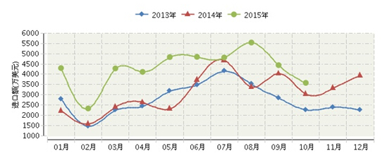 2015年1月~10月,全国玩具进口额增量明显