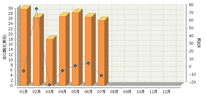 根据海关总署数据显示,2015年1月~7月,全国文体用品行业累计完成出口额在轻工主要商品出口中占4.5%,文体用品出口值累计同比增长5.16%,比轻工主要出口商品的平均水平略高2.28个百分点。从月度出口值的走势来看,今年前7个月中1月、3月、4月、7月出口均成同比下降态势,2月出口大幅增长79.64%。