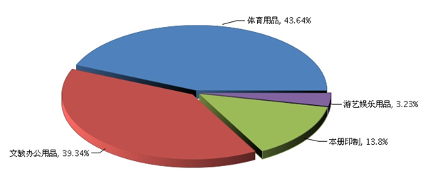 1~7月,文体用品行业4个子行业中,体育用品完成累计出口额占43.64%;文教办公用品完成累计出口额占39.34%;本册印制完成累计出口额占13.8%;游艺娱乐用品完成累计出口额占3.23%。