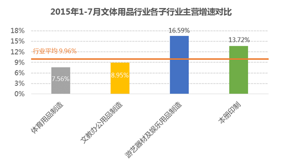 根据国家统计局数据显示,2015年1~7月,文体用品行业规模以上企业(下同)2232个,累计完成主营业务收入同比增长9.96%,增速较去年同期下降2.81个百分点。从月度主营业务收入来看,7月份完成主营业务收入同比增长8.98%,完成主营业务收入总额及增速都较6月小幅下降。