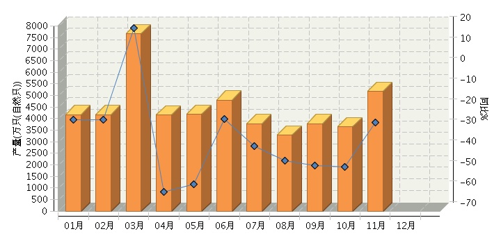 根据国家统计局公布数据,2015年1~11月全国碱性蓄电池行业累计完成产量同比增长-29.37%。其中:11月份完成产量同比增长-26.93%。2015年全国碱性蓄电池行业月度产量及同比如下图所示。