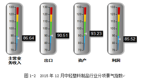2015年12月,塑料制品行业除资产景气指数外,主营业务、利润、出口指数均继续处在渐冷区间。