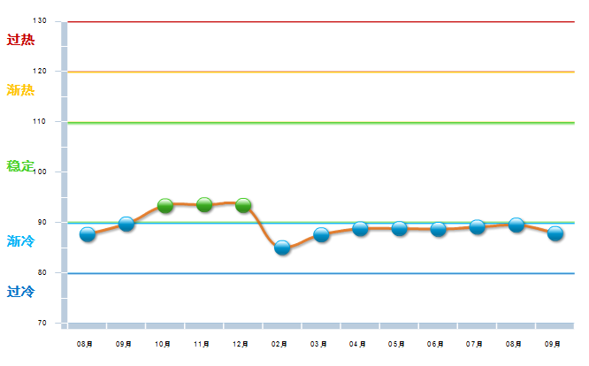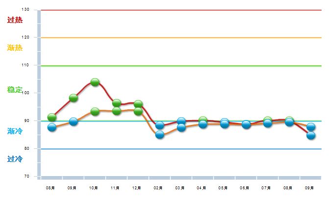 2014年10月中轻工艺美术景气指数在冲高到103.92开始回落,到15年2月已降至渐冷区域,经过几个月现仍在渐冷与稳定之间徘徊,15年7—8月运行在稳定区域的下限,9月降速加快进入渐冷区域。(参见图2)