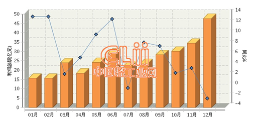 据国家统计局数据显示,2015年1~12月陶瓷行业规模以上企业累计完成利润总额同比增长5.23%,增速较上年回落6.69个百分点。其中12月份完成利润总额47.59亿元,为全年单月最高值,但同比下降2.29%,为全年单月最低增速,详见上图。