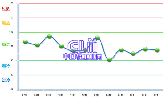 进入2015年以来,家具行业出口景气指数在“稳定”区间的100基准线以下升降交替运行之势不变,7月比6月下降了0.71个百分点(图1)。