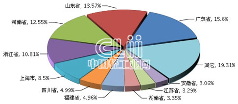 与1~7月相比,1~8月家具行业累计利润额居全国前十位地区中,除了江苏超过安徽成为第九以外,其他8个地区的排名不变。其中,广东累计利润总额(下同)占15.60%,山东占13.57%,河南占12.55%,浙江占10.81%,上海占8.50%,四川占4.99%,福建占4.96%,湖南占3.35%,江苏占3.29%,安徽占3.06%(图6)。