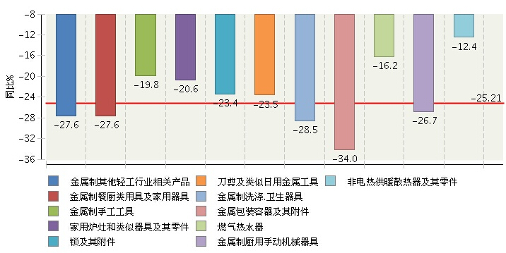 各子行业中,金属制餐厨类用具及家用器具、金属制手工工具、家用炉灶和类似器具及其零件、锁及其附件四个行业完成出口额占比较高,均超过10%。实现出口额分别为10.54亿美元、8.98亿美元、7.5亿美元和6.31亿美元。