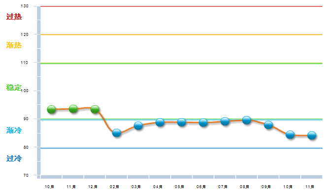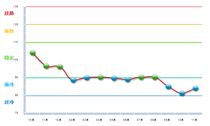 2014年10月中轻工艺美术景气指数在冲高到103.92开始回落,到15年2月已降至渐冷区域,经过几个月现仍在渐冷与稳定之间徘徊,15年7—8月运行在稳定区域的下限,10月降速加快接近渐冷区域下限,11月开始回升。(参见图2)
