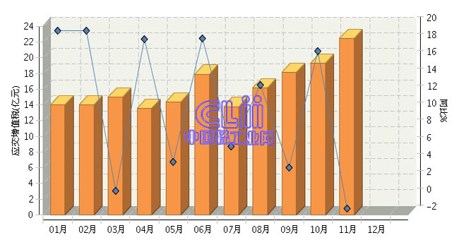 根据国家统计局公布数据:2015年1~11月,全国家具行业的累计应交增值税为178.56亿元,同比增长9.83%。其中:11月份应交增值税同比下降1.30%。