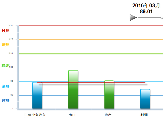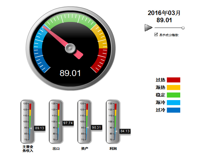 2015年2月至2016年3月,中轻皮革景气指数基本稳定,在90附近小幅波动,处于稳定提示区的下半区运行,至3月已经在渐冷提示区运行13个月(参见图3)。