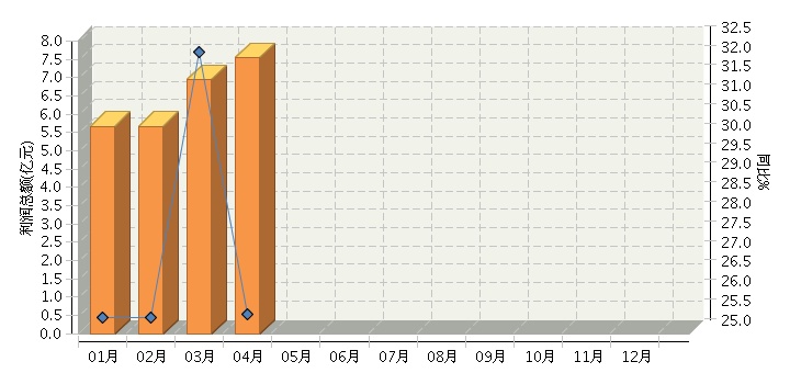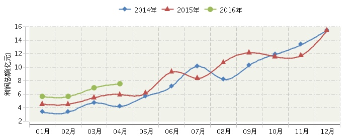 2016年1月~4月,全国玩具行业累计完成利润总额25.84亿元,同比增长27.20%。其中:1月份完成利润总额5.67亿元,同比增长25.42%;2月份完成利润总额5.67亿元,同比增长25.42%;3月份完成利润总额6.95亿元,同比增长32.21%;4月份完成利润总额7.55亿元,同比增长25.5%。