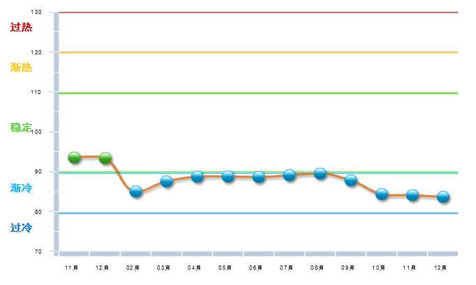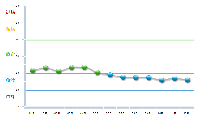 2014年11月中轻工艺美术景气指数在冲高到96.41开始回落,到15年2月已降至渐冷区域,经过几个月现仍在渐冷与稳定之间徘徊,15年7—8月运行在稳定区域的下限,10月降速加快接近渐冷区域下限,11月开始回升。(参见图2)