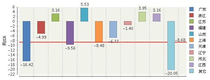 10个主要出口省份中,6个省份本行业出口同比下降,其中:广东省出口下降16.42%,福建省出口下降9.56%,上海市出口下降8.48%,浙江省出口下降4.99%;山东(+5.33%)、河北(+3.95%)、江苏(+3.16%)、江西(+3.16%)四省行业出口保持正增长。