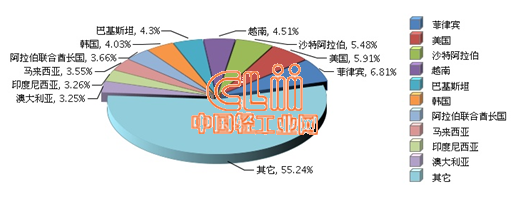 据海关数据显示,2016年1~6月我国陶瓷砖出口额排在前五位的贸易国依次是菲律宾、美国、沙特阿拉伯、越南、巴基斯坦。其中出口菲律宾累计2.06亿美元(同比增长63.16%),占我国陶瓷砖出口总额(下同)的6.81%;出口美国累计1.79亿美元(同比下降21.35%),占5.91%;出口沙特阿拉伯累计1.66亿美元(同比下降9.38%),占5.48%,详见图1。