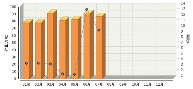 根据国家统计局公布数据,2016年1~7月,全国方便面行业累计完成产量同比增长3.94%。其中:1月份完成产量同比增长3.81%;2月份完成产量同比增长3.81%;3月份完成产量同比增长3.65%;4月份完成产量同比增长1.86%;5月份完成产量同比增长1.82%;6月份完成产同比增长13.55%;7月份完成产量同比增长9.76%。月度数据走势及同比增长情况如下图所示。