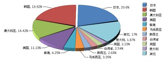 2016年1月~6月,上海玩具行业出口总额同比增长80.21%,极大扭转了去年同期的负增长态势。主要出口对象是日本、韩国、澳大利亚、美国、香港等国家和地区。其中:出口日本占20.6%,出口韩国占19.92%,出口澳大利亚占14.42%,出口美国占11.13%,同比增长-16.75%;出口香港占4.25%。