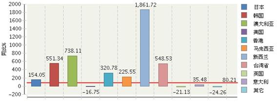 就增速来看,上海玩具行业对新西兰出口增长最为迅猛,呈现四位数增长态势,使得上半年新西兰进入上海玩具出口的前十国家之列。另外,对澳大利亚、韩国、香港等地区也呈现三位数的快速增长态势。