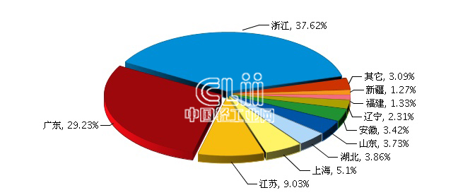 2016年1月~9月全国白炽灯泡行业累计出口额地区占比情况