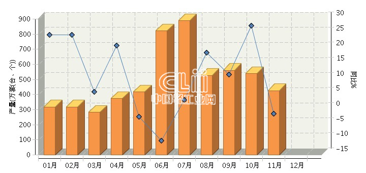 2016年1月~11月,河南灯具及照明装置行业累计完成产量5465.17万套,同比增长7.56%。其中:11月份完成产量424.82万套,同比增长-1.33%。