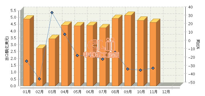 据海关数据显示,2016年1~11月,我国陶瓷制餐具累计出口44.78亿美元,同比下降23.88%。其中:11月份完成出口额4.63亿美元,同比下降28.74%。