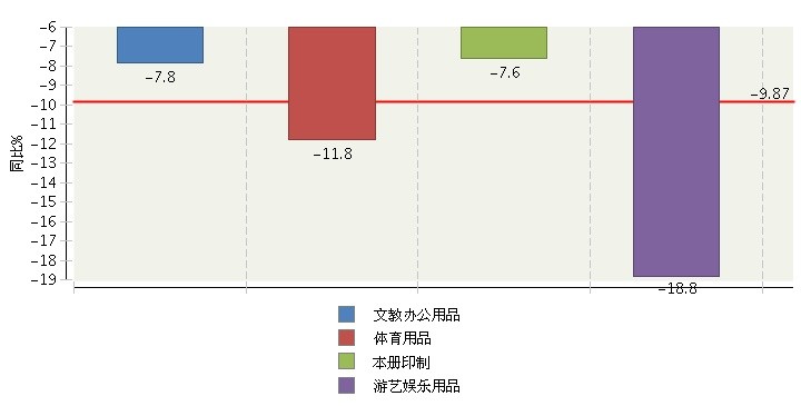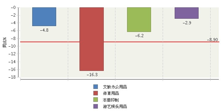 从子行业出口情况看,1-10月各子行业出口均较去年均成负增长态势,其中:文教办公用品完成累计出口额同比下降7.83%;体育用品完成累计出口额同比下降11.78%;本册印制完成累计出口额同比下降7.6%;游艺娱乐用品完成累计出口额同比下降18.82%。