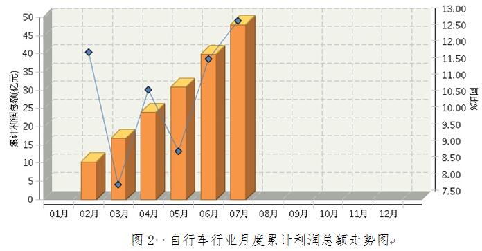 2017年1月~7月,全国自行车制造行业累计完成利润总额47.99亿元,同比增长12.90%,比上月累计增速高约1个百分点。(参见图2)。