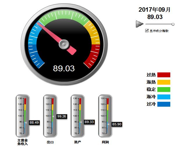 2016年8月至2017年9月,中轻皮革景气指数基本稳定,在90附近小幅波动,处于渐冷提示区运行(参见图3)。