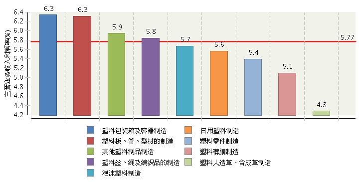 中国轻工业经济运行及预测预警系统监测显示:2017年1-8月,全国塑料制品行业规模以上企业主营业务收入利润率为5.77%,比1-7月回落0.05个百分点。各行业主营业务收入利润率情况见下图: