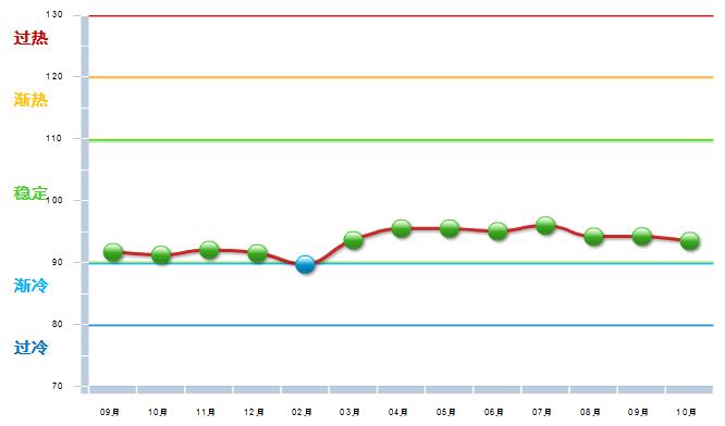 除2月份,中国玩具行业经济运行指数89.74下降至渐冷区间,其他月份全部保持在稳定区间,上半年呈微上升走势,8、9、10月份开始有下滑趋势。(参见图1-2)