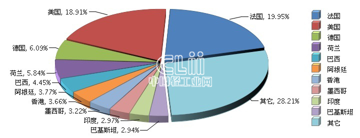 2017年,湖北照明行业完成累计出口额1.42亿美元,同比增长15.54%。出口额排在前五位的国家依次是法国、美国、德国、荷兰和巴西。其中:法国完成累计出口额0.28亿美元(占19.95%),同比增长4912.02%;美国完成累计出口额0.27亿美元(占18.91%),同比增长42.95%。