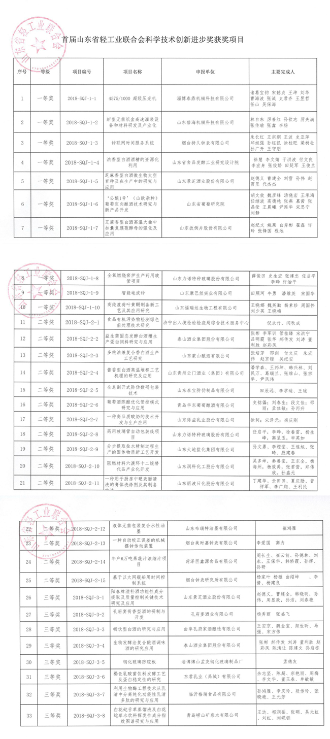 关于首届山东省轻工业联合会科学技术创新进步奖励的决定