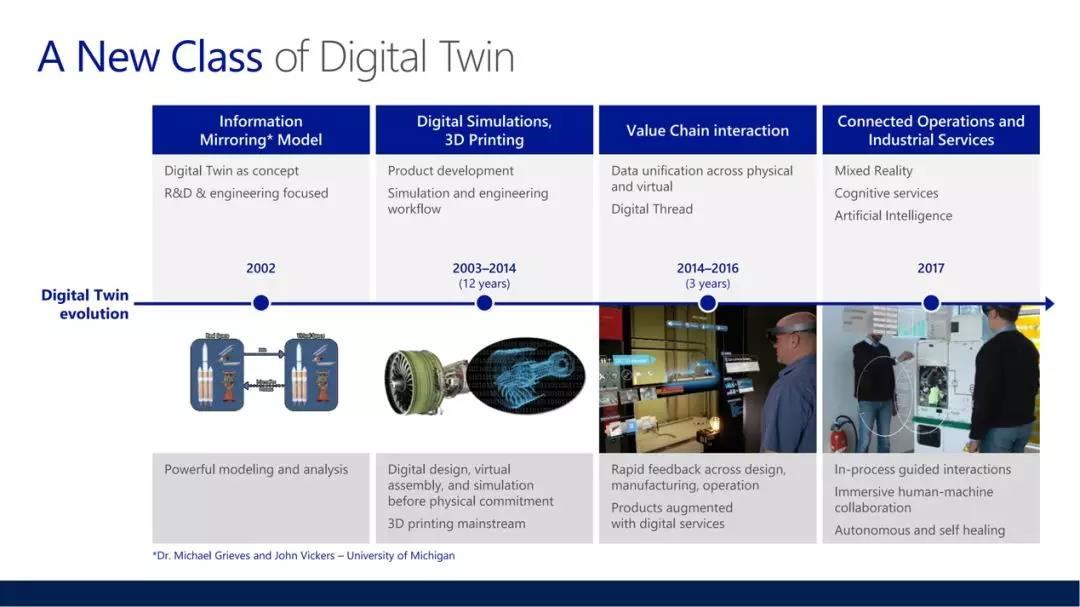 在那之后,数字孪生的概念逐步扩展到了模拟仿真、虚拟装配和3D打印这些领域,而到了2014年以后,随着物联网技术、人工智能和虚拟现实技术的不断发展,更多的工业产品、工业设备具备了智能的特征,而数字孪生也逐步扩展到了包括制造和服务在内的完整的产品周期阶段,并不断丰富着数字孪生的形态和概念。