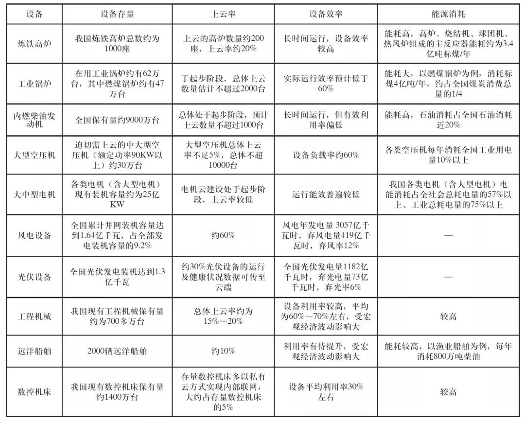 纵观现今各类工业设备,有基础、有条件、有需求、有上云潜力的工业设备主要有:以炼铁高炉、工业锅炉为代表的高能耗设备,以发动机、大中型电机、大型空压机为代表的通用动力设备,以风电、光伏设备为代表的新能源设备和以工程机械、远洋船舶、数控机床为代表的高价值智能设备。