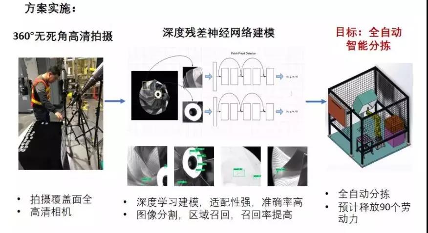 我们不影响整条生产线,搭建一个检控站,通过机械手对产品进行全方位的检测,把各种划伤、瑕疵通过凸现、模型做训练,精准率可以做到85%,召回率提高,平均度也会提高,而且简单易行。