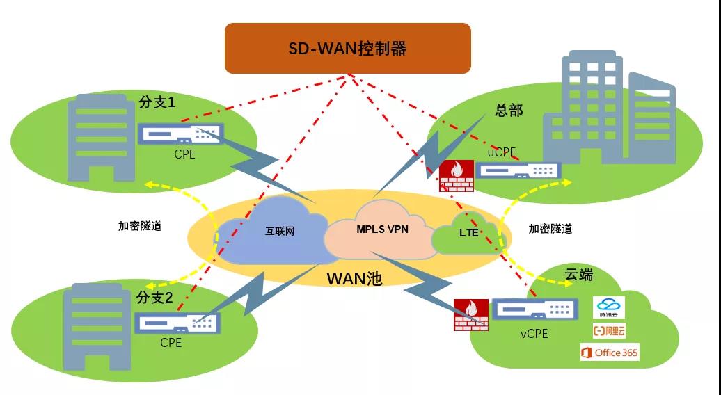 在传统企业组网中,专线(MPLS/MSTP VPN技术)在质量、性能和安全性上无疑是最佳选择,但是专线成本昂贵、开通时长、服务僵化,并且诸如物联网和工业互联网中的诸多场景并不可达,因此企业在广域组网中需要引入灵活、低成本的接入网络(如互联网、4G/LTE等),以实现广域网的高低搭配、互为备份和全域覆盖。而多种接入网络的引入,必然要求统一的调度和管理,基于WAN池化和网络集中控制的的SD-WAN技术便应运而生。不言而喻,SD-WAN的核心正是将已有的WAN连接(MPLS VPN、Internet、4G/LTE等)组成WAN池,然后通过SD-WAN集中控制器和边缘SD-WAN执行设备(CPE或vCPE),基于WAN池中链路实时情况和应用优先级进行智能选路,从而实现企业广域组网的最佳性价比和实时全链路质量保障。