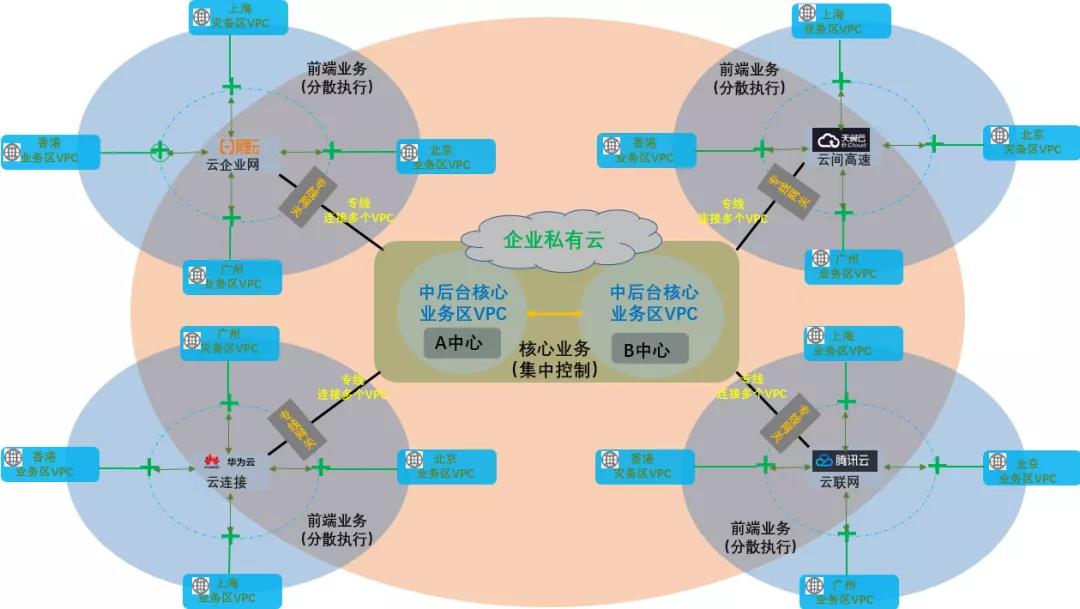 混合多云是大型多元化企业必然实施的云战略,云服务厂商跨全球多地域的数据中心布局和高速互通的广域骨干网络,为企业多元化的全球业务布局和广域空间的互联畅通提供了开通即用的云网解决方案。未来集团型混合多云将以企业数据中心为锚点,云专线辐射各大公有云(如阿里云、腾讯云、天翼云和华为云等),借云服务商数据中心云网互联之力(云企业网、云联网、云间高速和云连接),实现混合多云多中心的跨域组网和异构基础设施VPC之间的扁平互通,多元化应用负载将在异构多云上自由安置和迁移,业务数据在混合多云多中心间自由流动,实现业务系统跨越边界桎梏和地域阻隔的广域分布式扩展,以及应用数据在广域空间异地多云间的互为灾备。以四大公有云遍布全球的数据中心为依托,围绕集团产业互联之需,构建企业虚拟云端资源池,混合多云管理平台统一入口,形成集团私有数据中心承载后台核心业务,遍布全球广域空间公有云端资源池承载海外前置或边缘业务的混合多云格局,异构多云云网服务集中开通、统一监控,多云跨域云端资源统一编排,多云跨区分布式应用统一部署管理。