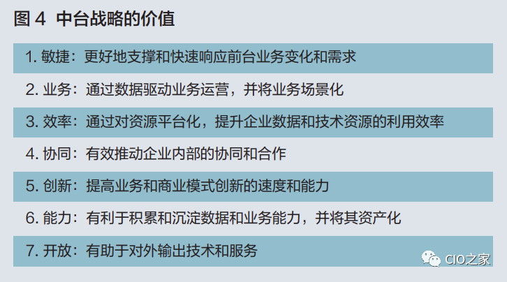 综合上面的讨论,我们可以清楚地看到,中台战略背后的真正驱动力是企业数字化转型的迫切需求,中台战略过去几年的发展也让企业看到了其在数字化转型实践中的重要性。我们将中台战略的价值总结为以下几条,毫无疑问,图4列出的每一条都对正在数字化转型奋斗中的企业至关重要: