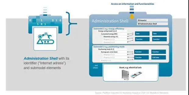 资产构成工业4.0基本单元(物理的/非物理的)的实体部分,管理壳构成工业4.0基本单元的虚拟部分,工业4.0的通信将各种基本单元加以连接。实际上管理壳是连接工业4.0与资产的接口,是存放资产的所有数据与信息的存贮器,它同时还是作为工业4.0标准化的通信网络的接口,它具有把无源的资产(如软件、文档)集成到工业4.0的网络的能力,它还能够用来把现有的设备升级迁移至工业4.0的大环境中。