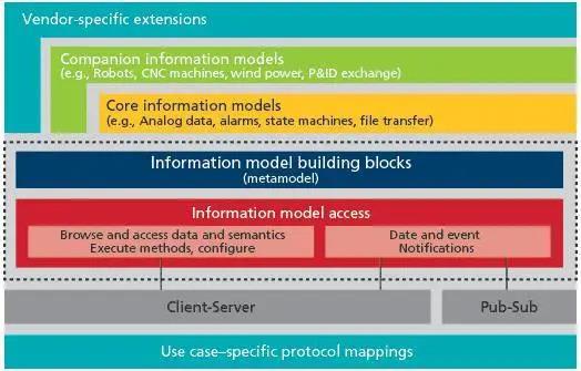 OPC UA的架构由三部分组成(见图3):底层是有关通信的部分,具体采用哪种通信协议不受限制,每一种具体用例都是所选用通信协议的映射,可以是有线的,也可以是无线的;目前用的最多的是以太网。中间部分是OPC UA的元信息模型和对此信息模型的存取。最上部分是供应商专用的扩展,也就是配套的信息模型,如机器人配套信息模型、CNC数控机床的配套信息模型、风电机械的配套信息模型,等等。