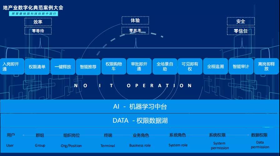 如何解决权限开通难、查询难、回收难和管理难?传统的解决办法就是行政、人事、安全和IT部门一起商量决定,面临着权利问题、组织架构变动后权限如何处理等问题。现在,通过数字化转型的方式让用户参与进来。将所有的系统权限放到可视化平台上,由用户自己选择所需权限、释放权限,将权限问题变为用户的互联网体验。实现业权一体化整体架构非常简单。从用户角度出发,将所有场景打通,实现入岗即开通、权限清单、智能推荐、权限购物车、审批即开通、全场景自助、可见即有权、全程追溯、智能审计和离岗即释放,即零等待、零思考、零信任的过程。