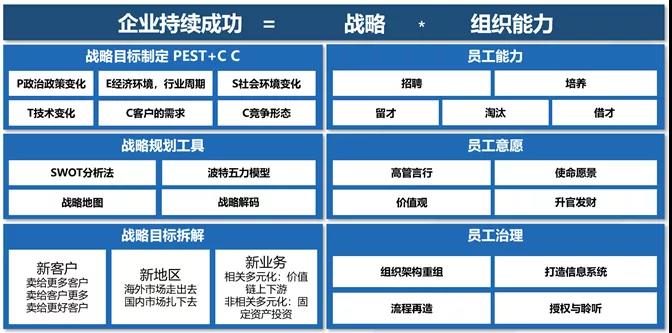根据PEST+CC分析方法帮助企业分析自身的不足,从新技术、新产品、新客户、新业务、新管理等方面寻找突破点来制定战略,同时为了确保战略有效执行,需要匹配相应的组织能力,其包括员工能力、员工意愿和员工治理三个方面。
